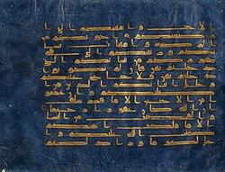 The main characteristic of the Kufic script "appears to be the transformation of the ancient cuneiform script into the Arabic letters" according to Enis Timuçin Tan.[5] Moreover, it was characterized by figural letters that were shaped in a way to be nicely written on parchment, building and decorative objects like lusterware and coins.[6] Kufic script is composed of geometrical forms like straight lines and angles along with verticals and horizontals.[7] Originally, Kufic did not have what is known as a differentiated consonant, which means, for example, that the letters "t", "b", and "th" were not distinguished by diacritical marks and looked the same.[7] However, it is still used in Islamic countries. In later Kufic Qur'ans of the ninth and early tenth century, "the sura headings were more often designed with the sura title as the main feature, often written in gold, with a palmette extending into the margin " comments Marcus Fraser.[8] Its use in transcribing manuscripts has been important in the development of Kufic Script. Earlier kufic was written on manuscripts with precision which contributed to its development. For instance, "the precision achieved in practice is all more remarkable because Kufic manuscripts were not ruled" says Alain George.[9] Moreover, he explains that Kufic manuscripts were laid out with a stable number of lines per page, and these were strictly parallel and equidistant.[9] One impressive example of an early Qur'an manuscript, known as the Blue Qur'an, features gold Kufic script on parchment dyed with indigo. It is commonly attributed to the early Fatimid or Abbasid court. The main text of this Qur'an is written in gold ink, thus the effect on looking at the manuscript is of gold on blue. According to Marcus Fraser, "the political and artistic sophistication and financial expense of the production of the blue Qur'an could only have been contemplated and achieved by a ruler of considerable power and wealth".[8]
