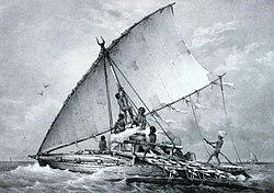 Canoe building was another art practiced only by the men. Canoes were not only the major form of communication, but were important in all aspects of Fijian society, from the gathering of food and transporting of crops to use in presentation ceremonies and they were instrumental in wars and politics which were rife in Fiji.[9] The art of canoe building was varied across the group and had several different types but of a similar design. The camakau was a small twin-hulled canoe for fishing or small transportation purposes. The most impressive canoes in Fiji were that of the Drua. In Fiji's early history before European involvement, control of the seaways was a major and decisive objective; disrupting or cutting off the enemies supply and reinforcements gave great advantage in battle and would ensure victory. Sea battles involving hundreds of canoes were frequent. The canoe, which inspired fear and awe and so often held the balance was the mighty Drua. One of the most elaborate and beautiful artifacts of Oceania, the Drua was a product of considerable group efforts and human sacrifice. Double hulled and of gigantic proportions, the Drua was a masterpiece of design and craftsmanship, requiring total community involvement in its construction and human sacrifice in its launching.[10] Its speed out at sea would be in excess of twenty knots and still remained highly manoeuvrable, it was capable of carrying upward of 150 warriors and took some 6 to 7 years to build and would vary in length from 100 feet to 118 feet and have a mast height of 60 to 70 feet, in the mid-19th century the following accounts were recorded: