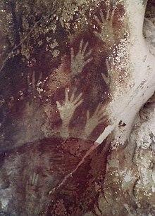 - ^ M. Aubert et al., "Pleistocene cave art from Sulawesi, Indonesia", Nature volume 514, pages 223–227 (09 October 2014). "using uranium-series dating of coralloid speleothems directly associated with 12 human hand stencils and two figurative animal depictions from seven cave sites in the Maros karsts of Sulawesi, we show that rock art traditions on this Indonesian island are at least compatible in age with the oldest European art. The earliest dated image from Maros, with a minimum age of 39.9 kyr, is now the oldest known hand stencil in the world. In addition, a painting of a babirusa (‘pig-deer’) made at least 35.4 kyr ago is among the earliest dated figurative depictions worldwide, if not the earliest one. Among the implications, it can now be demonstrated that humans were producing rock art by ∼40 kyr ago at opposite ends of the Pleistocene Eurasian world."
