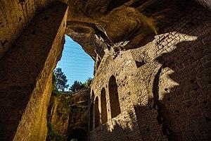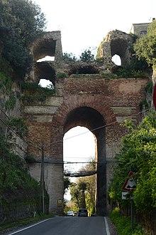 The Arco Felice was a 20 m high monumental entrance to the city built in a cut through Monte Grillo which Domitian made in 95 AD to avoid the long detour imposed by the via Appia, and allow easier access to Cumae along what was later called the via Domitiana while the bridge also carried a road along the ridge of the hill. It was built of brick and tiled in marble, and surmounted by two rows of arches of lighter concrete covered with brick. The piers had three niches on both sides where statues were placed.