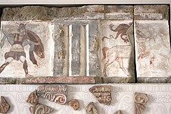 When the city was allied with the Romans in 338 BC a new temple was built with exceptional painted friezes and ornamentation which have been discovered though the temple was destroyed after a few decades by fire.