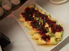 Cumberland sauce is a fruit sauce, usually used on non-white meats, such as venison, ham, and lamb. Coming out of the long-standing medieval tradition of piquant spicy fruit sauces rendered sharply sour with verjuice or vinegar and served with meat, but created sometime in the 19th century,[1] the sauce appears in various editions of Mrs Beeton's Book of Household Management. The sauce was invented in Germany, according to Alexis Soyer's recipe in The Gastronomic Regenerator (1846) for a port-wine based sauce accompanying boar’s head, which Janet Clarkson notes "contains what we think of as the required citrus note in the form of Seville orange rind (along with mustard)."[2] It is a more complex version of a simple redcurrant sauce.