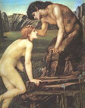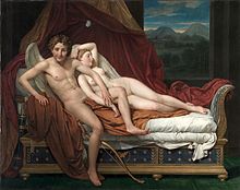 The most popular subjects for single paintings or sculpture are the couple alone, or explorations of the figure of Psyche, who is sometimes depicted in compositions that recall the sleeping Ariadne as she was found by Dionysus.[84] The use of nudity or sexuality in portraying Cupid and Psyche sometimes has offended contemporary sensibilities. In the 1840s, the National Academy of Art banned William Page's Cupid and Psyche, called perhaps "the most erotic painting in nineteenth-century America".[85] Classical subject matter might be presented in terms of realistic nudity: in 1867, the female figure in the Cupid and Psyche of Alphonse Legros was criticized as a "commonplace naked young woman".[86] But during the same period, Cupid and Psyche were also portrayed chastely, as in the pastoral sculptures Psyche (1845) by Townsend and Cupid and Psyche (1846) by Thomas Uwins, which were purchased by Queen Victoria and her consort Albert, otherwise keen collectors of nudes in the 1840s and 50s.[87]