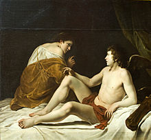 One of the most popular images from the tale was Psyche's discovery of a naked Cupid sleeping, found in ceramics, stained glass, and frescos. Mannerist painters were intensely drawn to the scene.[38] In England, the Cupid and Psyche theme had its "most lustrous period" from 1566 to 1635, beginning with the first English translation by William Adlington. A fresco cycle for Hill Hall, Essex, was modeled indirectly after that of the Villa Farnesina around 1570,[39] and Thomas Heywood's masque Love's Mistress dramatized the tale to celebrate the wedding of Charles I and Henrietta Maria, who later had her withdrawing chamber decorated with a 22-painting Cupid and Psyche cycle by Jacob Jordaens. The cycle took the divinization of Psyche as the centerpiece of the ceiling, and was a vehicle for the Neoplatonism the queen brought with her from France.[40] The Cupid and Psyche produced by Orazio Gentileschi for the royal couple shows a fully robed Psyche whose compelling interest is psychological, while Cupid is mostly nude.[41]