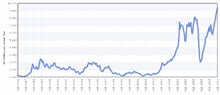 The price of copper has historically been unstable,[29] and its price increased from the 60-year low of US$0.60/lb (US$1.32/kg) in June 1999 to $3.75 per pound ($8.27/kg) in May 2006. It dropped to $2.40/lb ($5.29/kg) in February 2007, then rebounded to $3.50/lb ($7.71/kg) in April 2007.[30] In February 2009, weakening global demand and a steep fall in commodity prices since the previous year's highs left copper prices at $1.51/lb ($3.32/kg).[31] Between September 2010 and February 2011, the price of copper rose from £5,000 a metric ton to £6,250 a metric ton.[32]