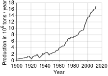 Copper has been in use at least 10,000 years, but more than 95% of all copper ever mined and smelted has been extracted since 1900,[27] and more than half was extracted during the last 24 years. As with many natural resources, the total amount of copper on Earth is vast, with around 1014 tons in the top kilometer of Earth's crust, which is about 5 million years' worth at the current rate of extraction. However, only a tiny fraction of these reserves is economically viable with present-day prices and technologies. Estimates of copper reserves available for mining vary from 25 to 60 years, depending on core assumptions such as the growth rate.[28] Recycling is a major source of copper in the modern world.[27] Because of these and other factors, the future of copper production and supply is the subject of much debate, including the concept of peak copper, analogous to peak oil.