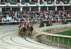 Curlin was established as the morning-line favorite by Churchill Downs official handicapper Mike Battaglia at 7–2 in spite of the fact that no horse had won the Derby with only three prior starts since 1915 (Regret), and no horse had won with no two-year-old preps since 1882.[14] He was the second betting choice when the race went off. Breaking from post 2 in a full field of 20, Curlin finished 3rd to Street Sense and Hard Spun. In the Preakness Stakes two weeks later, Curlin stumbled out of the gate and raced by the stands the first time in sixth, well off a hot early pace. As the leaders began to tire, he made a bold run on the far turn and entered the stretch four wide, opening the door for Street Sense to sneak by to his inside. With one furlong to go, Street Sense opened a length and a half lead. However, Curlin rallied to beat the Kentucky Derby winner in the final stride. His final time of 1:53.46, at the time, tied the track record set by Tank's Prospect in 1985, Louis Quatorze in 1996, and unofficially Secretariat in 1973 (Secretariat's time was later officially determined to be 1:53.00).[15] Curlin was the even-money favorite in the Belmont Stakes. He engaged the champion filly Rags to Riches in a lengthy stretch duel and lost by a head. Rags to Riches was the first filly to win the Belmont Stakes in over a century.