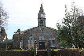 The parish church lies south of the current main road, amongst a small cluster of buildings which represent the original village. It was built in a simple rectangular form, with a pediment on its north (entrance) side and a low central spire, in 1784 by James Thompson of Leith. Its interior was remodelled in 1835 by the Edinburgh architect, David Bryce, and in 1848 the windows were enlarged by the architect David Cousin. As the graveyard pre-dates the church it is presumed that the church replaced an earlier church.[3]