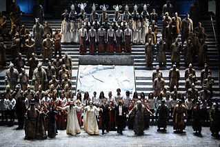 A curtain call (often known as a walkdown or a final bow) occurs at the end of a performance when one or more performers return to the stage to be recognized by the audience for the performance.[1][2] In musical theatre, the performers typically recognize the orchestra and its conductor at the end of the curtain call. Luciano Pavarotti holds the record for receiving 165 curtain calls, more than any other artist.[3]