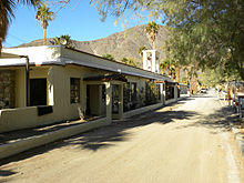 In 1944, Springer and his new fiancée Helen filed a mining claim on federal land to 12,800 acres (51.8 km2) in California's Mojave Desert, claiming a tract about 8 miles (13 km) long and 3 miles (4.8 km) wide.[1] The land contained the remains of an 1860 Army post and a railroad station on the defunct Tonopah and Tidewater Railroad. He named the settlement Zzyzx as a gimmick to ensure that it would be "the last word" in health. Zzyzx's original encampment consisted of 20 tents, and he recruited homeless men from Los Angeles' Skid Row to build simple concrete buildings.[8] Springer created an imitation hot springs – which he attempted to pass off as genuine – by using a boiler to heat several pools.[5][11] In time, Springer erected a sixty-room hotel, a church, a cross-shaped health spa with mineral baths, a radio broadcast studio, a private airstrip dubbed "Zyport" and several other buildings which included a castle. The "Boulevard of Dreams" was a divided parkway leading to an oasis on Lake Tuendae, later identified as the habitat of the endangered Mohave chub.[1] While building his retreat, he spent half the week in Los Angeles, still recording his radio program, and rounding up workers to build his new resort by offering room and board at Zzyzx in exchange for labor.[5]