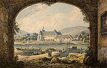 The Cusanusstift in Bernkastel-Kues 1831, located on the Middle Moselle river in the district of Bernkastel-Wittlich, in Rhineland-Palatinate, Germany; aquatint engraving by F. Hegi after Karl Bodmer, hand-colored