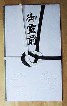 People attending a Japanese funeral bring money called "kōden" (香典)[21] either in special funeral offering envelopes "kōden-bukuro" (香典袋) or small plain white envelopes.[22] Of the "kōden-bukuro", the folded end at the bottom should be placed under the top fold, as the opposite or the bottom fold over the top one suggests that bad luck will become a series of misfortunes. Formally, there is a small bag called Fukusa (袱紗, also written as 帛紗 and 服紗) in which you put the envelope and bring to the funeral.