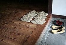 Wooden geta are provided for short walks outside when entering the house. It is generally considered polite to wear shoes instead of sandals, but sandal wearers may carry a pair of white socks to put over their bare feet or stockings, so that their bare feet will not touch the slippers that the host offers, or they may use tabi socks, worn with the sandals. The shoes are turned around so that the toe faces the door after taking them off. During the winter time, if a guest is wearing a coat or hat, the guest will remove the coat or hat before the host opens the door. When the guest is leaving, he or she does not put on the coat or hat until the door has closed.