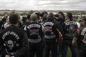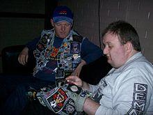 Cut-offs are usually made from leather or denim jackets with their sleeves removed, or cut very short, and often adorned with patches, badges and painted artwork that display motorcycle club affiliations known as colours,[1][2] or alternatively band names, political affiliations, beliefs, or sexual acts performed.[3]