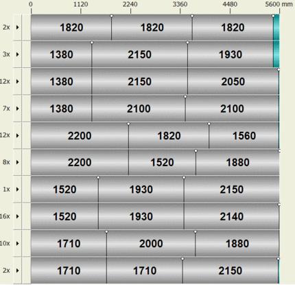 There are 308 possible patterns for this small instance. The optimal answer requires 73 master rolls and has 0.401% waste; it can be shown computationally that in this case the minimum number of patterns with this level of waste is 10. It can also be computed that 19 different such solutions exist, each with 10 patterns and a waste of 0.401%, of which one such solution is shown below and in the picture: