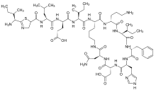 Cyclic peptides are polypeptide chains which contain a circular sequence of bonds. This can be through a connection between the amino and carboxyl ends of the peptide, for example in cyclosporin; a connection between the amino end and a side chain, for example in bacitracin; the carboxyl end and a side chain, for example in colistin; or two side chains or more complicated arrangements, for example in amanitin. Many cyclic peptides have been discovered in nature and many others have been synthesized in the laboratory. Their length ranges from just two amino acid residues to hundreds. In nature they are frequently antimicrobial or toxic; in medicine they have various applications, for example as antibiotics and immunosuppressive agents.[1] Thin-Layer Chromatography (TLC) is a convenient method to detect cyclic peptides in crude extract from bio-mass.[2]