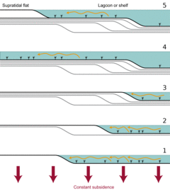 Ginsburg (1971) suggested that asymmetric, shallowing-upward parasequences could be produced under conditions of steady subsidence and constant eustatic sea level by landward transport of carbonate sediment from subtidal zones, leading to progradation of inter- and supratidal zones. Continuing progradation reduces the size of the productive subtidal area, thus reducing sediment supply until it cannot keep pace with subsidence. When the area subsides and becomes supratidal once again, the inter- and supratidal areas are re-flooded starting a new cycle.[4]