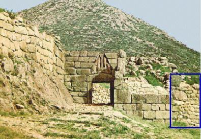 Modern archaeologists use "Cyclopean" in a more restricted sense than the description by Pausanias; while Pausanias attributes all of the fortifications of Tiryns and Mycenae, including the Lion Gate, to the Cyclopes, only parts of these walls are built in Cyclopean masonry. The accompanying photograph shows the difference between Cyclopean masonry (shown in the blue rectangle), and the ashlar masonry of the Lion Gate.
