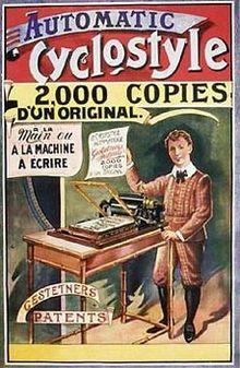 In 1875 Thomas Edison received a patent for the "electric pen", which a decade later was superseded by the mimeograph machine. The cyclostyle was a more automated type of mimeograph machine that produced reproductions faster. See stencil duplicator and Gestetner Cyclograph Company.