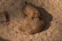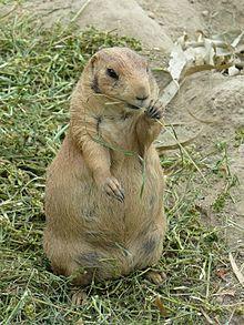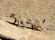 The black-tailed prairie dog (Cynomys ludovicianus) is a rodent of the family Sciuridae found in the Great Plains of North America from about the United States-Canada border to the United States-Mexico border. Unlike some other prairie dogs, these animals do not truly hibernate. The black-tailed prairie dog can be seen above ground in midwinter. A black-tailed prairie dog town in Texas was reported to cover 25,000 sq mi (64,000 km2) and included 400,000,000 individuals.[3] Prior to habitat destruction, this species may have been the most abundant prairie dog in central North America. This species was one of two described by the Lewis and Clark Expedition in the journals and diaries of their expedition.