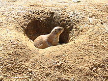 Burrows created by black-tailed prairie dogs serve as refuges from the external environment and are one of the most important features of their colonies. Burrows are used for breeding, rearing young, and hiding from predators, and are maintained from generation to generation, and serve as stabilizers on the physical and social aspects of the colony.[9] Black-tailed prairie dog nests are located underground in burrows and are composed of fine, dried grass. Nest material is collected throughout the year by both sexes and all age classes.[6][9] Tunnel depths in central Oklahoma were typically 50–60 in deep.[29] Most colonies contain 20 to 57 burrows/acre.[9][10]