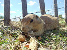 Black-tailed prairie dogs are selective opportunists, preferring certain phenological stages or types of vegetation according to their needs.[9][14][30] When forage is stressed by grazing, drought, or herbicides, they change their diets quickly. Grasses are preferred over forbs,[10][24] and may comprise more than 75% of their diets, especially during summer.[24][30] Western wheatgrass, buffalo grass, blue grama [9][10][30] and sedges (Carex spp.) are preferred during spring and summer. Scarlet globemallow (Sphaeralcea coccinea) [9][15][24][30] and Russian thistle (Salsola kali) [31] are preferred during late summer and fall, but are sought out during every season.[10][15][24] During winter, plains prickly pear (Opuntia polyacantha), Russian thistle, and underground roots are preferred.[9][30] Shrubs such as rabbitbrush (Chrysothamnus spp.), winterfat (Krascheninnikovia lanata), saltbush (Atriplex spp.), and sagebrush (Artemisia spp.) are also commonly eaten.[31] Water, which is generally not available on the short-grass prairie, is obtained from vegetation such as plains prickly pear.[30] Koford [10] estimated one black-tailed prairie dog eats about 7 lb (3 kg) of herbage per month during summer.[31] Cutworms,[31] grasshoppers,[10] and old or fresh American bison scat are occasionally eaten.[6] For a detailed list of foods eaten by black-tailed prairie dogs by month, and ratings of those foods' forage value to cattle and sheep, see.[31] For a complete list of vegetation preferred by the black-tailed prairie dog, see.[32]