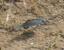 There are two primary breeding strategies: In species of small isolated habitats like springs, each large male (or medium-sized male, if large males are absent) defends a territory and displays to visiting females that will lay their eggs inside the territory.[13][26] In at least some species, small males will attempt to fertilize eggs by sneaking into a territory of a larger male.[26] Once deposited, neither sex cares for the eggs, although they do get a level of protection by being inside the territory of a male. A male will attempt to attract several females to lay their eggs in his territory and a female may lay eggs in the territories of several males.[13] Another breeding strategy is used by species that inhabit rivers. Here the males do not maintain a territory and groups of pupfish gather to breed. A male typically will lead a female to the edge of the group to spawn, although on occasion it may occur in the middle of the group.[13] The eggs of Cyprinodon pupfish are adhesive and stick to the substrate,[13] or they are covered in sand.[25]