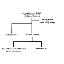 The Cypriot National Guard, in its existent form, was initially mobilised circa mid-1963 as a Greek Cypriot infantry force with some small elements dedicated to artillery, anti-armour and light armour forces. This force inherited some mixed equipment from its pre-civil war organisation, including 54 British-made 25-pounder gun-howitzers, 40 Marmon-Herrington Armoured Car (Mk. IVF),[18] 4 Shorland light armoured cars, 2 Daimler Dingo light armoured cars, 5 C-17 light armoured trucks and a variety of machine guns, mortars and a few anti-tank weapons (namely M20 Super Bazookas and a small number of PIAT weapons). The Greek Cypriots also possessed some Bofors 40mm anti-aircraft guns,[19] along with a variety of Bedford trucks and old US made jeeps.