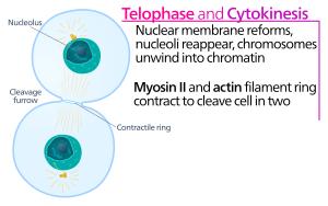 Animal cell cytokinesis begins shortly after the onset of sister chromatid separation in the anaphase of mitosis. The process can be divided to the following distinct steps: anaphase spindle reorganization, division plane specification, actin-myosin ring assembly and contraction, and abscission.[5] Faithful partitioning of the genome to emerging daughter cells is ensured through the tight temporal coordination of the above individual events by molecular signaling pathways.