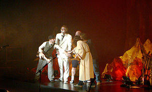 The band spent the first twelve years of their career playing concerts acoustic; just Black and Gass on acoustic guitars, with no backing instruments apart from occasional guests. Black and Gass have expressed angst they experience before concerts saying: "We're always looking for a loophole. Pretty much every concert we've ever done, we're trying to find a way to cancel the show at the last minute."[146] The band mainly spent their first five years performing in Los Angeles, with occasional concerts in New York and Colorado. The band embarked on their first ever tour in the summer of 1999. In 2001, Tenacious D started their second nationwide concert tour, performing at larger venues, many of which sold out.[3] In the fall of 2001, Black and Gass toured with Weezer alongside Jimmy Eat World, performing in large arenas. In 2002, the band supported Kid Rock at a handful of concerts, before starting their third domestic tour, Le Tour!, playing many medium-sized theaters. Later that year and in early 2003, the band would perform three small European tours, and an Australian tour.[147]