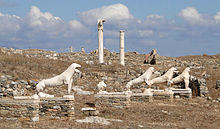 - The "Terrace of the Lions", also dedicated to Apollo by the people of Naxos shortly before 600 BCE. It originally had nine to twelve squatting, snarling marble guardian lions along the Sacred Way; one is inserted over the main gate to the Venetian Arsenal. The lions create a monumental avenue comparable to Egyptian avenues of sphinxes. (There is a Greek sphinx in the Delos Museum.) Today only seven of the original lions remain.