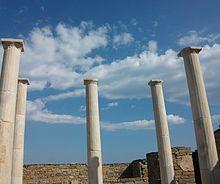 Investigation of ancient stone huts found on the island indicate that it has been inhabited since the 3rd millennium BC. Thucydides identifies the original inhabitants as piratical Carians who were eventually expelled by King Minos of Crete.[2] By the writing of the Odyssey, the island was already famous as the birthplace of the twin gods Apollo and Artemis (although there seems to be some confusion of Artemis' birthplace being either Delos or the island of Ortygia). Between 900 BC and 100 AD, Delos was a major cult centre where Dionysus and Titaness Leto, mother of the twin deities Apollo and Artemis, were revered. Eventually acquiring Panhellenic religious significance, Delos was initially a religious pilgrimage for the Ionians.