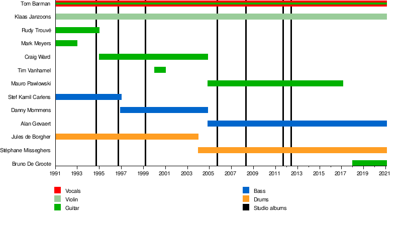 In October 2016, they announced through Facebook that Mauro Pawlowski would leave the band after a final concert in Antwerp the following February. On 6 February 2018, they announced through Facebook that Bruno De Groote will be the new guitar player of the band.[16]