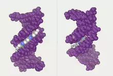 Compared to B-DNA, the A-DNA form is a wider right-handed spiral, with a shallow, wide minor groove and a narrower, deeper major groove. The A form occurs under non-physiological conditions in partly dehydrated samples of DNA, while in the cell it may be produced in hybrid pairings of DNA and RNA strands, and in enzyme-DNA complexes.[48][49] Segments of DNA where the bases have been chemically modified by methylation may undergo a larger change in conformation and adopt the Z form. Here, the strands turn about the helical axis in a left-handed spiral, the opposite of the more common B form.[50] These unusual structures can be recognized by specific Z-DNA binding proteins and may be involved in the regulation of transcription.[51] A 2020 study concluded that DNA turned right-handed due to ionization by cosmic rays.[52]
