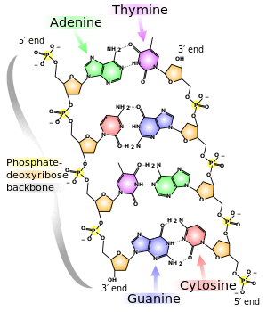 The backbone of the DNA strand is made from alternating phosphate and sugar groups.[14] The sugar in DNA is 2-deoxyribose, which is a pentose (five-carbon) sugar. The sugars are joined together by phosphate groups that form phosphodiester bonds between the third and fifth carbon atoms of adjacent sugar rings. These are known as the 3′-end (three prime end), and 5′-end (five prime end) carbons, the prime symbol being used to distinguish these carbon atoms from those of the base to which the deoxyribose forms a glycosidic bond. Therefore, any DNA strand normally has one end at which there is a phosphate group attached to the 5′ carbon of a ribose (the 5′ phosphoryl) and another end at which there is a free hydroxyl group attached to the 3′ carbon of a ribose (the 3′ hydroxyl). The orientation of the 3′ and 5′ carbons along the sugar-phosphate backbone confers directionality (sometimes called polarity) to each DNA strand. In a nucleic acid double helix, the direction of the nucleotides in one strand is opposite to their direction in the other strand: the strands are antiparallel. The asymmetric ends of DNA strands are said to have a directionality of five prime end (5′ ), and three prime end (3′), with the 5′ end having a terminal phosphate group and the 3′ end a terminal hydroxyl group. One major difference between DNA and RNA is the sugar, with the 2-deoxyribose in DNA being replaced by the alternative pentose sugar ribose in RNA.[12]