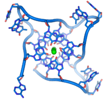 DNA quadruplex formed by telomere repeats. The looped conformation of the DNA backbone is very different from the typical DNA helix. The green spheres in the center represent potassium ions.[60]