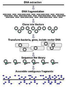 Shotgun sequencing is a sequencing method designed for analysis of DNA sequences longer than 1000 base pairs, up to and including entire chromosomes. This method requires the target DNA to be broken into random fragments. After sequencing individual fragments, the sequences can be reassembled on the basis of their overlapping regions.[64]