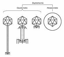 Duplodnaviria contains dsDNA viruses that encode a major capsid protein (MCP) that has the HK97 fold. Viruses in the realm also share a number of other characteristics involving the capsid and capsid assembly, including an icosahedral capsid shape and a terminase enzyme that packages viral DNA into the capsid during assembly. Two groups of viruses are included in the realm: tailed bacteriophages, which infect prokaryotes and are assigned to the order Caudovirales, and herpesviruses, which infect animals and are assigned to the order Herpesvirales.[10]