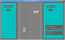 DONKEY.BAS is an extremely simple driving game in which the player controls a car but cannot steer, accelerate or brake, only changing lanes to avoid a series of donkeys on the road. There is no goal other than to avoid donkeys.