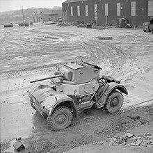 The Daimler Armoured Car was a parallel development to the Daimler Dingo "Scout car", a small armoured vehicle for scouting and liaison roles. It was another Birmingham Small Arms design. A larger version designed on the same layout as the Dingo fitted with the turret similar to that of the Mark VII Light Tank and a more powerful engine.[2] Like the scout car, it incorporated some of the most advanced design concepts of the time and is considered one of the best British AFVs of the Second World War. The 95 hp engine was at the rear linked through a fluid flywheel to a Wilson preselector gearbox and then a H-drive arrangement with propshafts to each wheel. Four wheel steering similar to early models of the Scout car was considered but not implemented following experience with the Dingo.