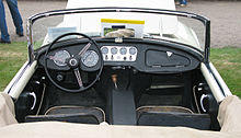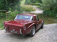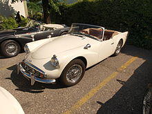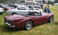 The original version, later called the A-spec, could reach a speed of 120 mph (193 km/h), but the chassis, a "14-gauge ladder frame with cruciform bracing" based on the Triumph TR3,[10] flexed so much that doors occasionally came open, marring its reputation.[10][11] Bumpers were originally an optional extra.[12] With the basic specification not including full bumpers, the A-spec. cars have two short, chromium-plated 'whiskers' on the body on either side of the front grille and two short, vertical bumpers, or "overriders" at the rear, which were not included if the rear bumper was optioned.[12] Early A-spec. cars had recesses behind the door handles, but these were phased out.[13]