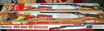 The Red Ryder BB Gun is a BB gun made by Daisy Outdoor Products and introduced in the spring of 1940 that resembles the Winchester rifle of Western movies.[6] Named for the comic strip cowboy character Red Ryder (created in 1938, and who appeared in numerous films between 1940 and 1950, and on television in 1956), the BB gun is still in production, though the comic strip was cancelled in 1963.