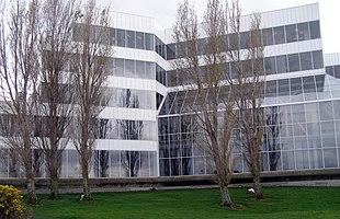 The building itself is a five-story design plus a penthouse, with one subterranean parking level. The exterior features a skin that is an innovative all porcelain panel design, giving the building a shimmering appearance in the sunlight or uplights by night; moreover most of the fenestration was slanted approximately 45 degrees from vertical, designed to reduce glare and enhance energy conservation, but also lending a futuristic effect.[13]