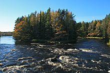 The river then continues to Avesta where it strongly changes character.[N 1] It leaves a deep valley and enters into a flat country, uniquely marked by some eskers.[N 1] During the remaining 120 kilometres (75 mi) that it travels to the sea, the river, now called the Lower Dalälven (Nedre Dalälven), alternates between large bays (fjärdar) and rapids.[N 1] This section is also characterized by regular flooding, sometimes over vast areas.[N 2] The first rapids are those at Avesta, called Storfors and Lillfors (big chute and little chute), after which the river forms the lake Bäsingen, then the rapids Näs bruk, then the lake Bysjön. It forms the frontier between Västmanland County to the south and Dalarna County to the north. It then forms the rapids at Tyttbo, and right after, one of its largest fjärds, that of Färnebofjärden National Park, forming the frontier between Uppsala County to the south and Gävleborg County to the north. More than 200 islands are strewn over this fjärd.[13] The river continues to the rapids at Gysinge and then another great fjärd, Hedesundafjärden-Bramsöfjärden. The river passes through the rapids at Söderfors towards Untrafjärden, then by the rapids of Untra towards Marmafjärden, and then the rapids of Lanforsen. Finally, goes through its last rapids at Älvkarleby before rejoining the Baltic Sea.