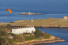 Dalkey lies by the coast, between Dún Laoghaire (and Sandycove and Glasthule) and Killiney. Off the coast are Dalkey Island (up to the 18th century, also "St. Begnet's Island"), Malden Rock, Clare Rock, Lamb Island, and, further offshore, The Muglins, which have their own lighthouse. The town is on fairly level land, but the district rises to Dalkey Hill (140 m), the northern peak of a ridge which continues to Killiney Hill to the southwest; the two hills are now contained within the public park known as Killiney Hill Park.[8] Along the coast are the natural harbour at Bullock, a couple of small inlets, Sorrento Point just east of the town proper, and the northern park of Killiney Bay.