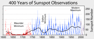 Like the Maunder Minimum and Spörer Minimum, the Dalton Minimum coincided with a period of lower-than-average global temperatures. During that period, there was a variation of temperature of about 1 °C in Germany.[5]