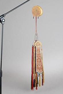 Damaru of all kinds are traditionally paired with a long sash or tail called a chöpen. The chöpen is attached to the end of the drum's handle so that it waves about while the drum is being played. They are most commonly made of brocade or silk using the colors of the tantric elements. On smaller damaru, the chöpen is usually found without adornment, but on chöd damaru, the tail will often feature several items which have been sewn onto the fabric. These adornments commonly include but are not limited to: a polished silver mirror or melong, a set of small bells, strips of tiger and/or leopard skin, one or more precious stones (i.e. dzi bead), and any number of small brass trinkets.