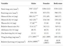 The study found significant differences in overall wing size and in the physical dimensions of wings. Males tended to have larger wings than females, and were heavier than females, on average. Both males and females had similar thorax dimensions (wing muscles are contained in the thorax). Female monarchs tended to have thicker wings, which is thought to convey greater tensile strength. This would make female wings less likely to be damaged during migration. Also, females had lower wing loading than males (wing loading is a value derived from the ratio of wing size to body weight), which would mean females require less energy to fly.[29] A table with the average measurements of each variable is shown.