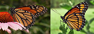 Commonly and easily mistaken for the similar viceroy butterfly, the monarch's wingspan ranges from 8.9 to 10.2 centimetres (3.5–4.0 in).[5] The uppersides of the wings are tawny orange, the veins and margins are black, and there are two series of small white spots in the margins. Monarch forewings also have a few orange spots near their tips. Wing undersides are similar, but the tips of forewings and hindwings are yellow brown instead of tawny orange and the white spots are larger.[22] The shape and color of the wings change at the beginning of the migration and appear redder and more elongated than later migrants.[23] Wings size and shape differ between migratory and non-migratory monarchs. Monarchs from eastern North America have larger and more angular forewings than those in the western population.[8]