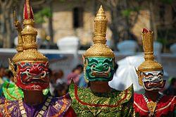 Khon (ໂຂນ [kʰǒːn]) is the most stylised of the Lao dance-dramas, with troupes of male and female dancers in elaborate costumes and masks performing very graceful movements demonstrating their great flexibility, and very common dance-drama form for the Phra Lak Phra Ram. Each dancer plays a character in the drama, although most of the narration comes from a singing chorus to the side. Lakhone (ລະຄອນ [lāʔ kʰɔ́ːn]) dances are usually only performed by females, but male lakhone dancers are not unknown. Instead of each dancer portraying an individual character, such as the Khon dance-dramas, the dancers mimic the scene and events together. There is more variety of dance-dramas performed in the Lakhon tradition.[3]
